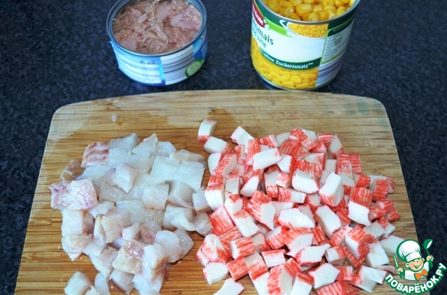 Затем крабовые палочки и кусочки рыбного филе, немного поперчить.