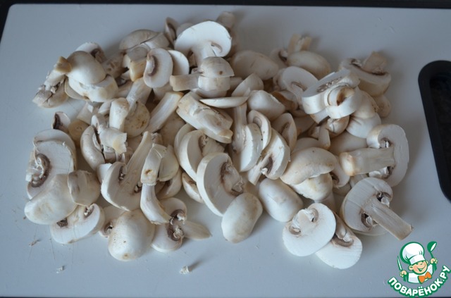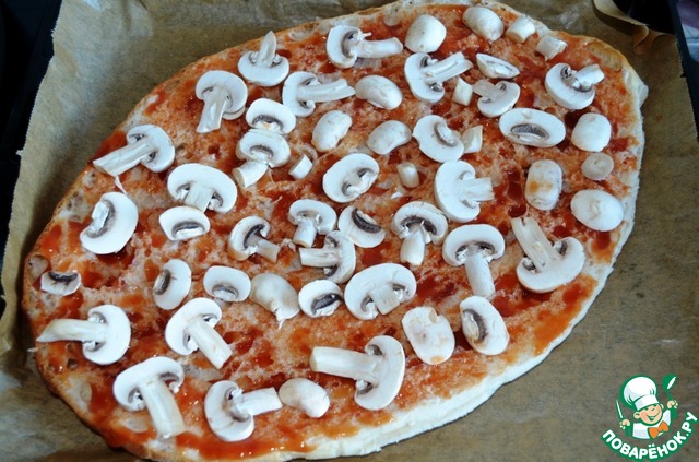 Одну половину лаваша положить на лист для выпекания, смазать его кетчупом (можно промазать и другими соусами), посыпать порезанными шампиньонами.