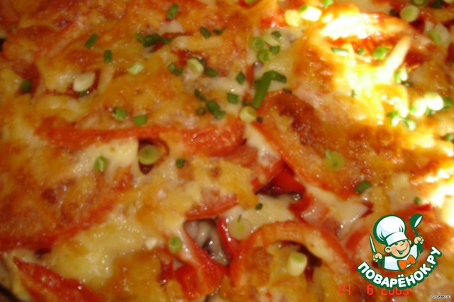 колбасу мелко нарезать и посыпать на перец(колбасы можно побольше,но у меня не оказалось больше).
