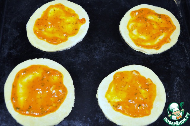 Раскатываю шарики на лепешки и вырезаю по блюдцу круги, наношу соус.
