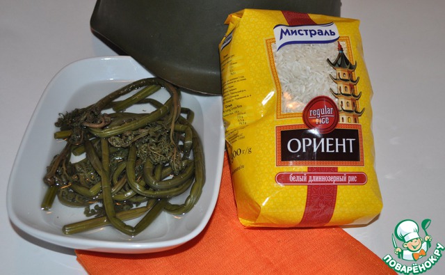 Папоротник предварительно вымочила, рис поставила варить. Для этого рецепта использовала рис "Ориент".