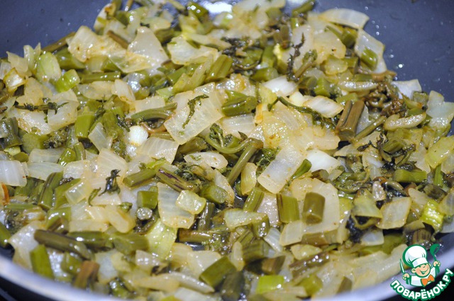На сковороде обжарю лук и папоротник.