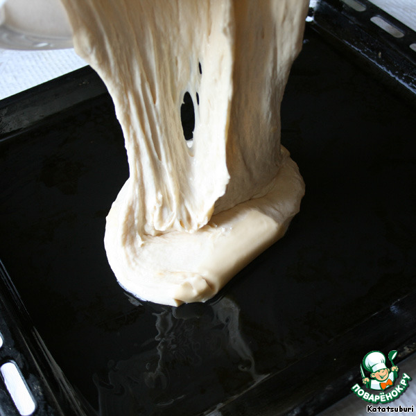 Не обминая, сразу же я выкладываю тесто на смазанный растительным маслом противень.