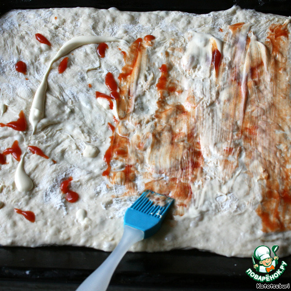 Пицца без соуса сухая и невозможная, поэтому берем по хорошей ложке кетчупа/томатного соуса и сметаны/майонеза и смазываем поверхность теста. В качестве соуса подойдет и любая овощная икра (это на зиму).