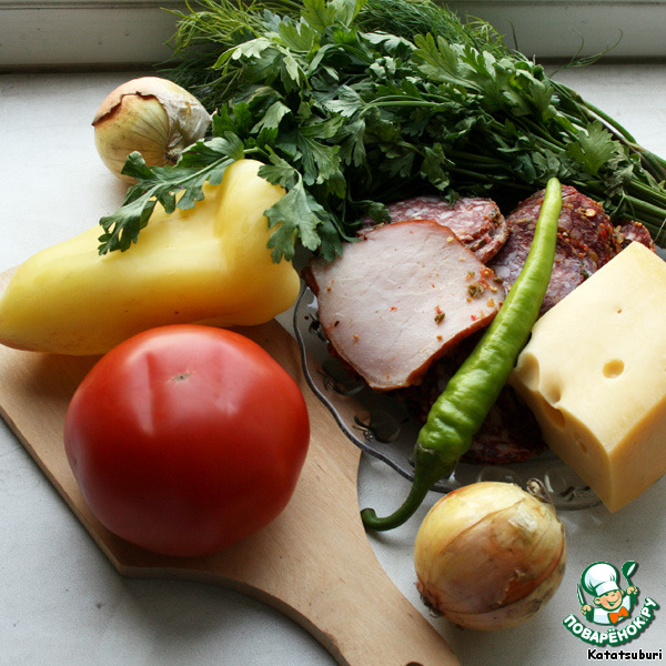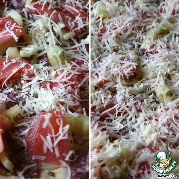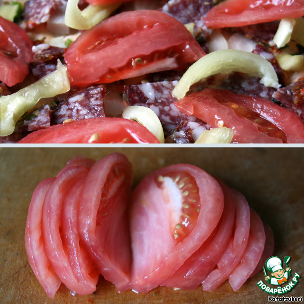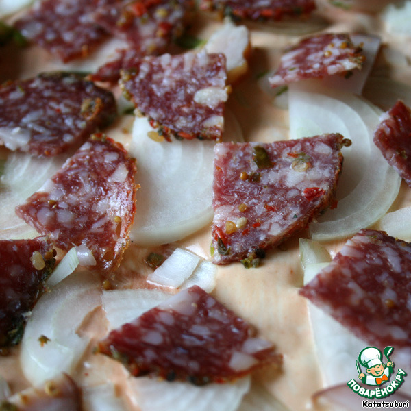 Колбаска и ветчинка. Вообще, мясная часть - на Ваш вкус, тут нет предела экспериментам. Как-то я делала даже пиццу с печеночным паштетом...