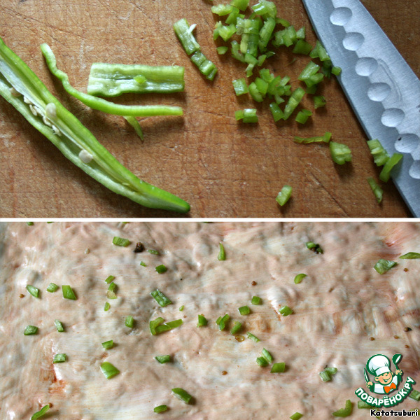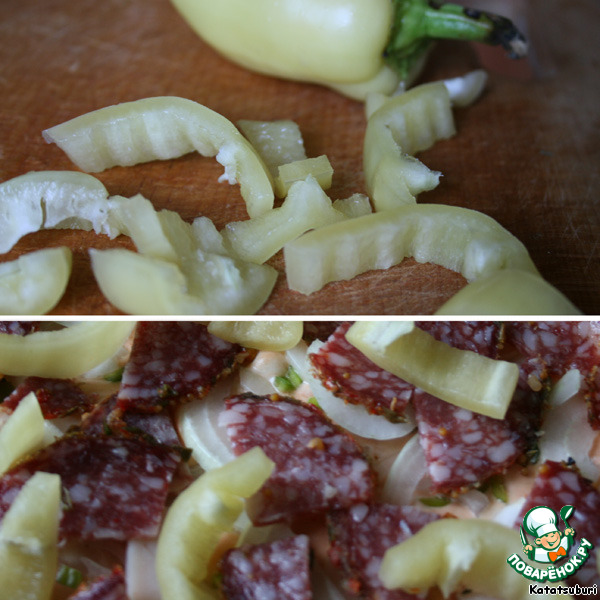 Острый перчик пепперони на самом деле есть недозрелый чили, поэтому и вери-вери хот. Резать в перчатках. Детям не давать. А взрослым - очень даже: поднимает настроение, улучшает пищеварение. Мелко режем, равномерно распределяем по поверхности