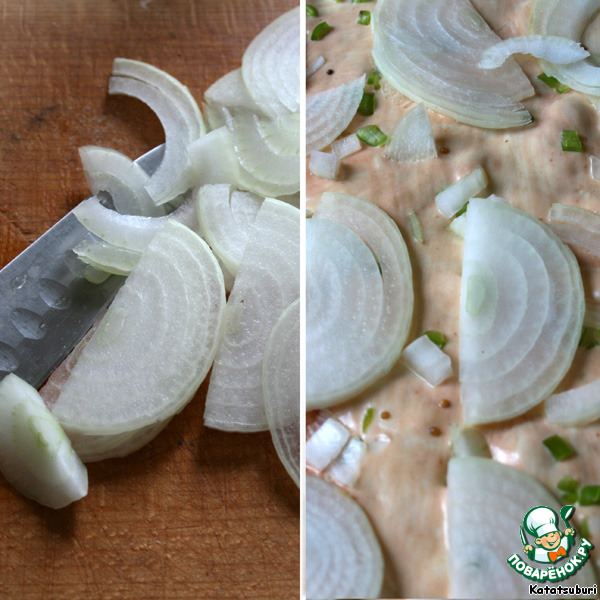 Лук - полукольцами или как нравится. Идеально подходит белый - он сочный и не такой ядреный, но у меня не оказалось его в нужный момент, взяла обычную молодую "репку".