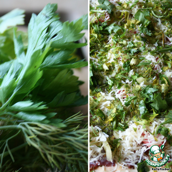 Режем зелень (мелко ли, крупно ли - это кому как нравится). Присыпаем сыр. Лучше взять нашу классику - петрушку и укроп, итальянцы базилик и рукола хороши в сыром виде.