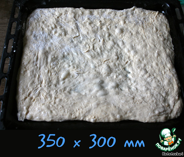 Ком слегка присыпаю мукой, и влажными руками формирую равномерную по высоте лепешку на весь противень.