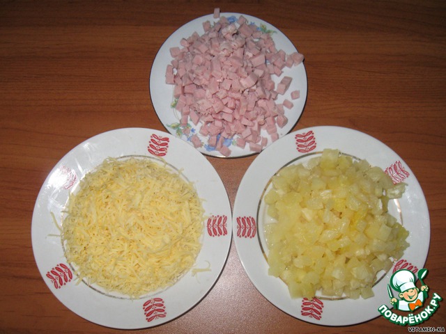 Готовим начинку: ветчину порежeм маленькими квадратиками, ананасы, в данном случае, уже порезаны дольками (но я люблю, когда все продукты мелко порезаны, поэтому ананасовые дольки измельчаю на более маленькие кусочки). Сыр натереть на мелкой терке.