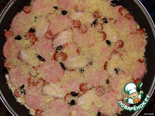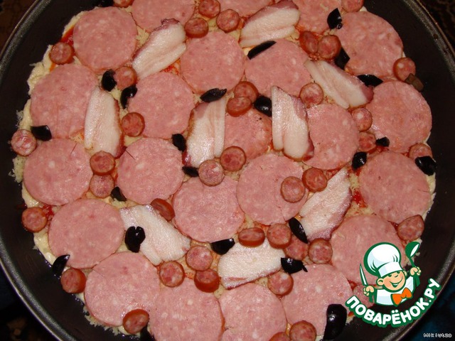после чего тесто равномерно разлить по противню, смазанному жиром, и поставить в духовку на 5—7 минут до образования светло-золотистой корочки. Затем тесто вынуть, густо смазать его кетчупом. посыпать тертым сыром и равномерно выложить на него мелко нарезанную колбасу, лук нарезанный кольцами и маслины.