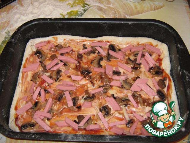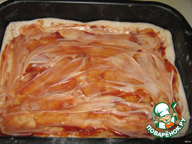 Раскатанное тесто, толщиной 3-5 мм выкладываем на смазанный подсолнечным маслом противень(также противень посыпаем слегка мукой). Затем смазываем кетчупом и майонезом.