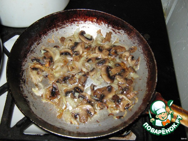Шампиньоны режем вдоль, режем лук полукольцами и обжариваем на сковороде в небольшом количестве масла.