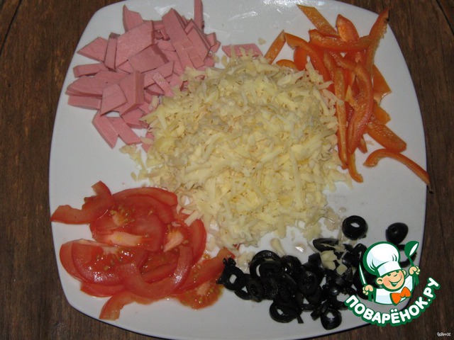 Ветчину(колбасу вареную) нарезаем не очень тонкой соломкой, перец продолговатыми полосками, оливки кружками, сыр трем на терке, помидоры полукольцами.