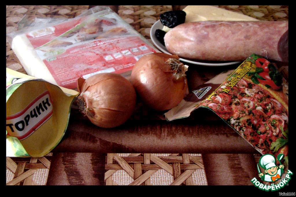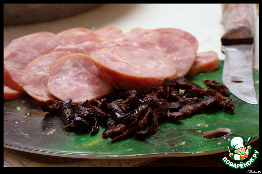 Тоненько нарезаем ветчину и соломкой чернослив...