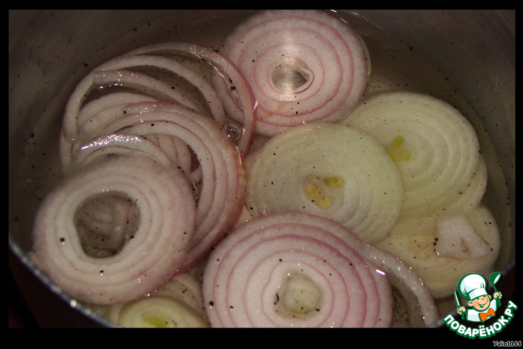 Прежде всего режем кружочками лук, перчим его, добавляем уксус, воду и накрываем крышкой.