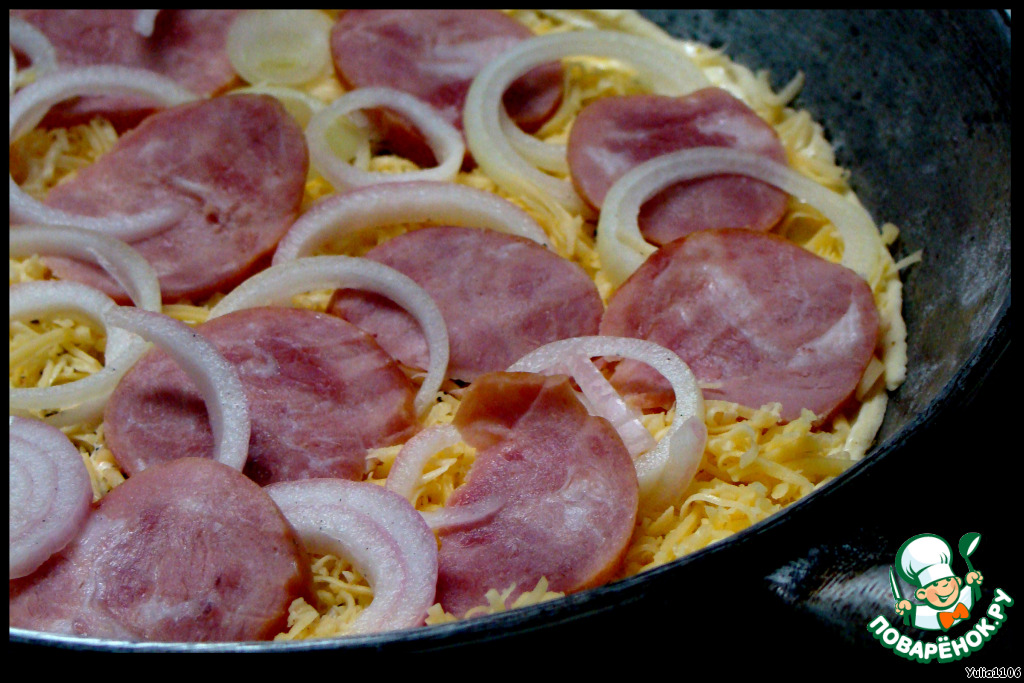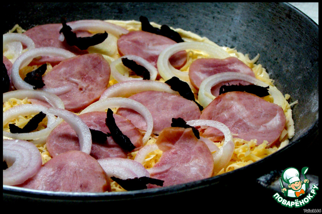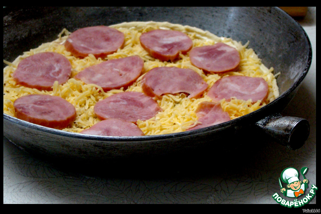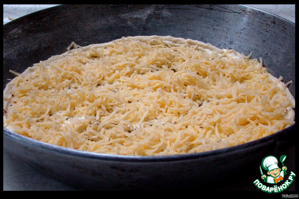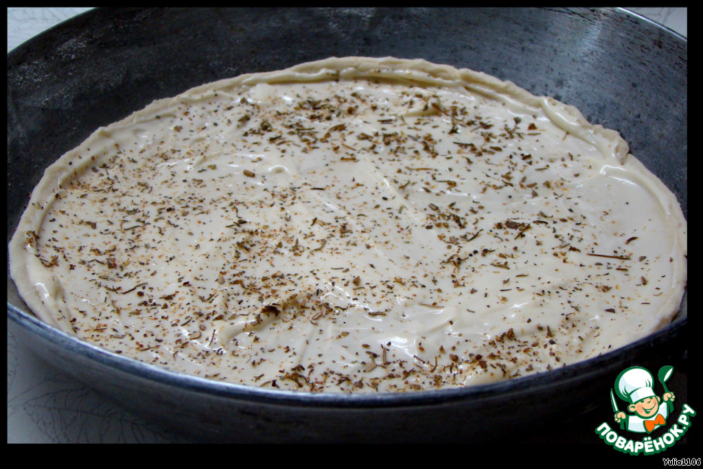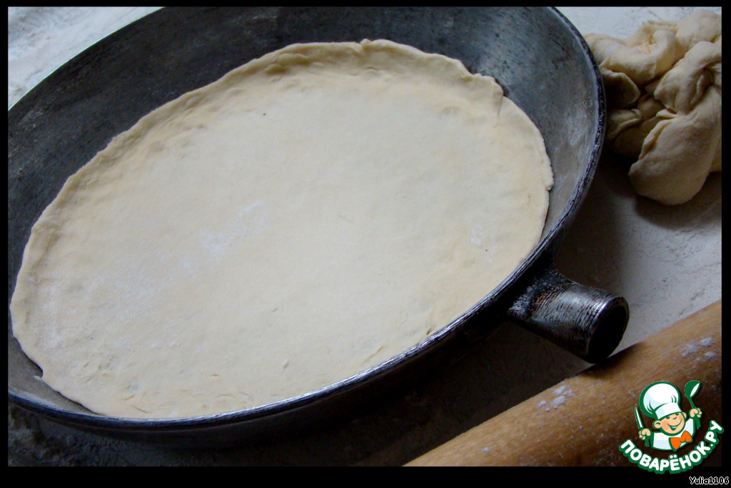 Тоненько раскатываем тесто и укладываем в форму или противень (я брала сковороду)