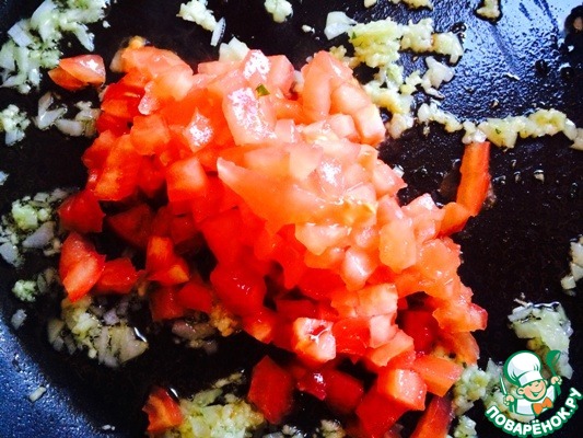 Итак, у помидоров снять кожицу и порезать их на маленькие кубики. В сковороде обжарить на оливковом масле мелко порезанный лук и чеснок - секунд 20.