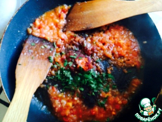 Затем зелень, любимые специи. Тушить минут 5 на среднем огне, помешивая. Получится густой соус.
