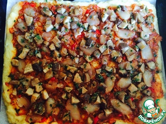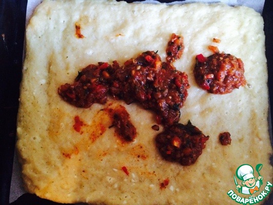 На застеленный противень выложить массу, ручками формируя основу для пиццы предпочитаемой толщины. Учтите, что при выпечке корж немного поднимется.