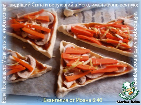 Смазываем треугольники томатным соусом. Дальше кладем грибы и тыкву. Тыкву стараемся выкладывать так, чтобы было как бы веточки у елочки.