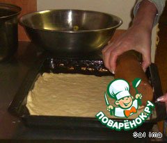 Растереть противень растительным маслом и заранее раскатанное тесто в тонкую пластину толщиной 2,5 мм накладываем на противень так, чтобы края возвышались на 1 см. (Возможно вариант раскатать тесто на тонкую пластину сразу на противне).