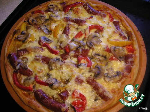 Сладкий перец нарезать соломкой. Копченые колбаски очистить от пленки и нарезать кусочками см 4 длиной, а затем пополам. Тесто раскатать и выложить в форму. Смазать кетчупом. Покрыть луком. Равномерно выложить на лук обжаренные грибы, полоски перца и копченные колбаски. Слегка посолить и приправить смесью перцев.