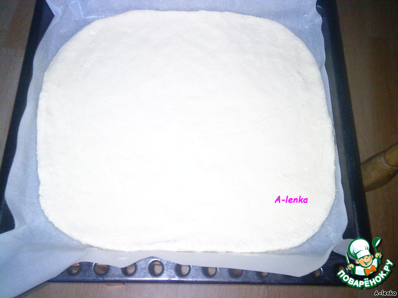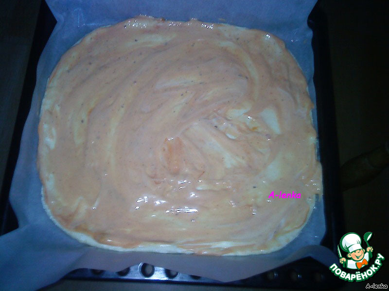 Противень застилаем бумагой для выпечки, выкладываем тесто и разминаем его до нужной формы основания