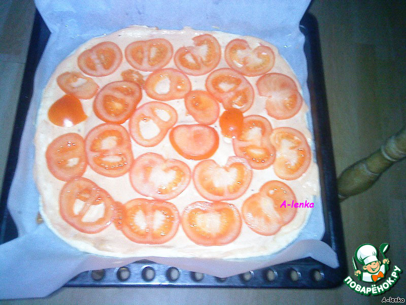 На тесто выкладываем помидор так, чтобы он закрыл все тесто