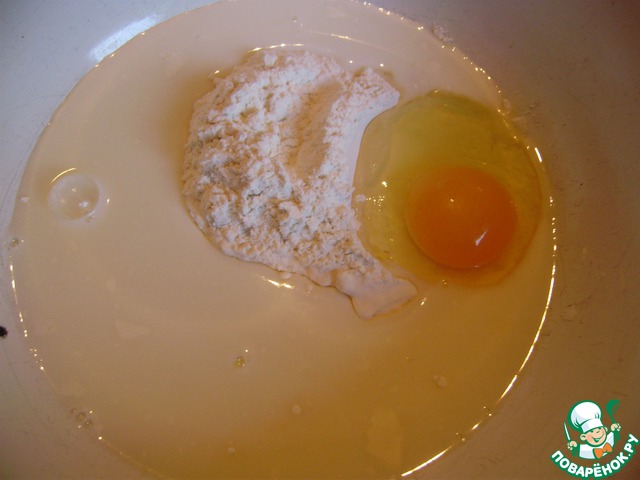 Делаем тесто. Смешиваем яйцо, молоко и соль. Тесто должно получиться консистенции густой сметаны, поэтому муку начинаем добавлять с 1/2 стакана, если жидкое, тогда добавляем еще.