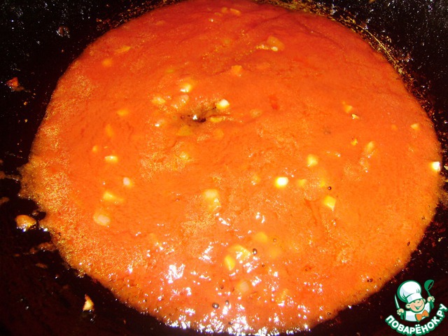 На сковороде нагреваем растительное масло, выкладываем лук. Жарим до золотистого цвета, добавляем чеснок. Как чеснок зарумяниться. добавляем томатную пасту. Если необходимо добавляем воду, чтобы получить консистенцию кетчупа. Немного протушиваем и снимаем с огня.