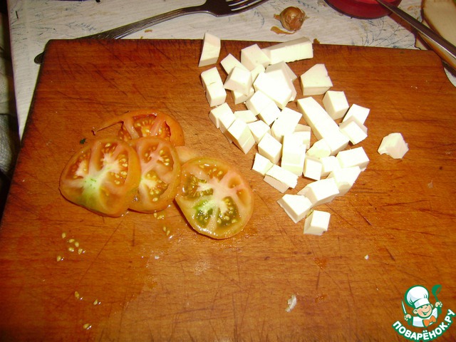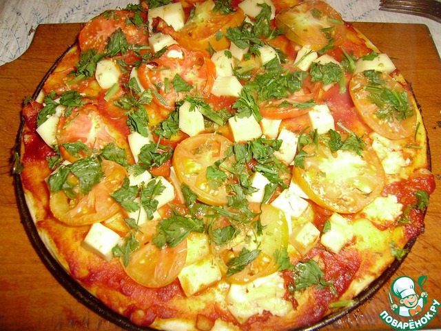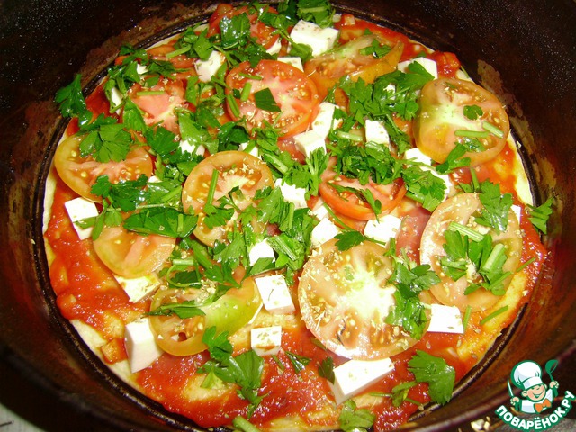 И ставим нашу пиццу обратно в духовку до готовности начинки, чтоб пропеклись помидоры и расплавился сыр. Можно сделать это в микроволновке.