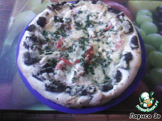 Тесто на пиццу делала в ХП первый раз. Нужно было делать две пиццы. Вышла пышновата, но не беда: моя дочурка краешки любит больше серединок. Да, ещё, время приготовления указано с учетом замеса теста в ХП, а это 45 минут.
