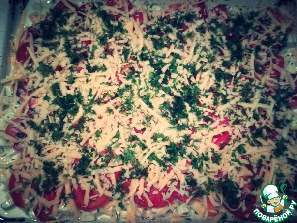 наши помидоры и посолите, затем кладем натертый сыр, и сверху зелень.