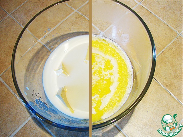 Ставим емкость в микроволновую печь на высокую мощность минуты на 4, чтобы молоко нагрелось и масло в нем растопилось, размешиваем.