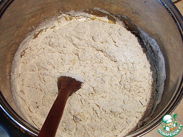Равномерно всыпаем ровно 500 г муки. Берем лопаточку и начинаем круговыми движениями перемешивать.