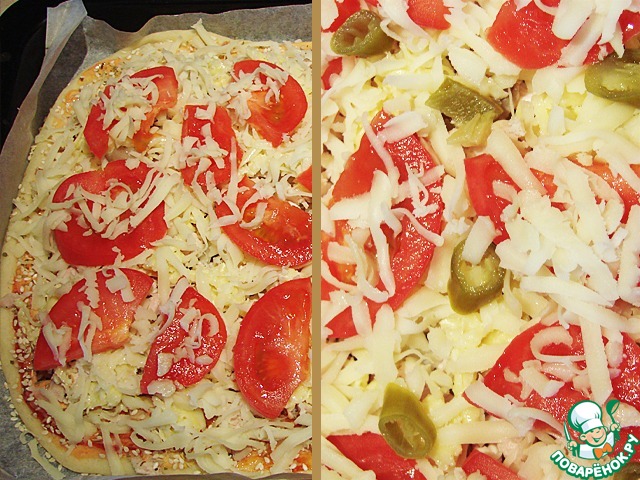 Засыпаем моцарелллой (большую часть), а бортики присыпаем кунжутом, выкладываем поверх кусочки помидора, присыпаем оставшейся моцареллой, выкладываем кусочки халапеньо и еще раз чуть орегано, ставим в духовку.