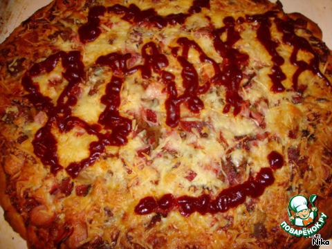 Тесто делаем как обычно... в тeплом молоке растворить дрожжи. Соль и сахар по вкусу. Добавить растительное масло(тесто будет мягким долгое время). Пока тесто поднимается(его нужно будет обмять раза два - три), приготовим начинку для пиццы. Мелко порезать репчатый лук, смешать с кетчупом и сушенной зеленью. Тесто раскатать, перенести на противень. Намазать смесью из кетчупа и лука. Порезать сосиски кружочками. Грибы. Ветчину. Салями. Сверху насыпать тeртый сыр. Капельки кетчупа. Пицца получилась острой, т. к. острый кетчуп, много перца в салями.
