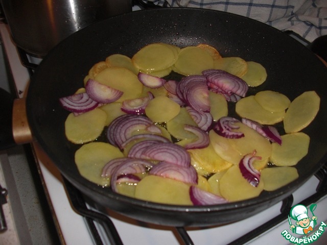 В это время нарежьте картошку тонкими кольцами и обжарьте на хорошо разогретой сковородке на оливковом масле, немного посолите и поперчите. Через 10 мин добавьте лук нарезанный полукольцами.