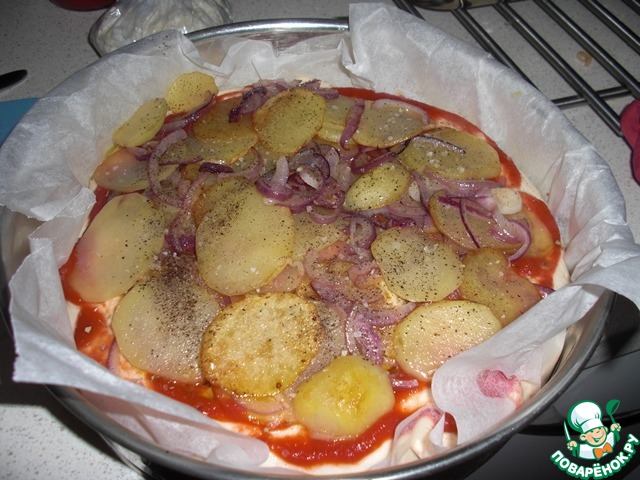 Не пережарьте картофель, так как когда ваша пицца будет почти готова, за минут, 5-10 до того как вынимать ее из духовки выложите на нее картофель с луком.