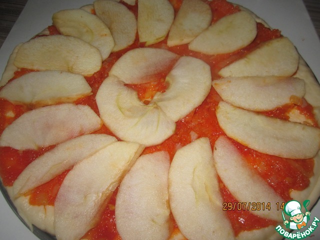 Пока тесто отдыхает, готовим заливку для яблочной пиццы. Лук и чеснок нарезаем мелким кубиком, обжариваем на сковороде. У помидоров снимаем кожицу (предварительно обдав их кипятком и холодной водой), мелко нарезаем и добавляем к луку и чесноку. Тушить на медленном огне до консистенции густого соуса. Яблоки очистить, вынуть сердцевину и нарезать тонкими дольками сбрызнуть лимонным соком.