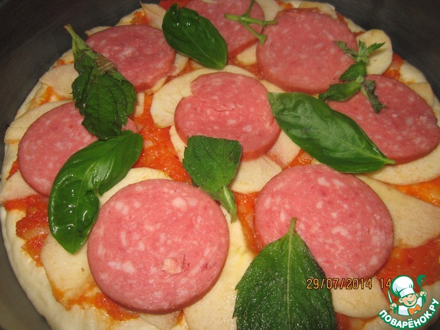 | Рецепт пиццы яблоками и салями – вкусно, быстро и оригинально! Тесто нежное, мягкое с хорошей корочкой. Начинка кисло сладкая, сырно -сливочная. |