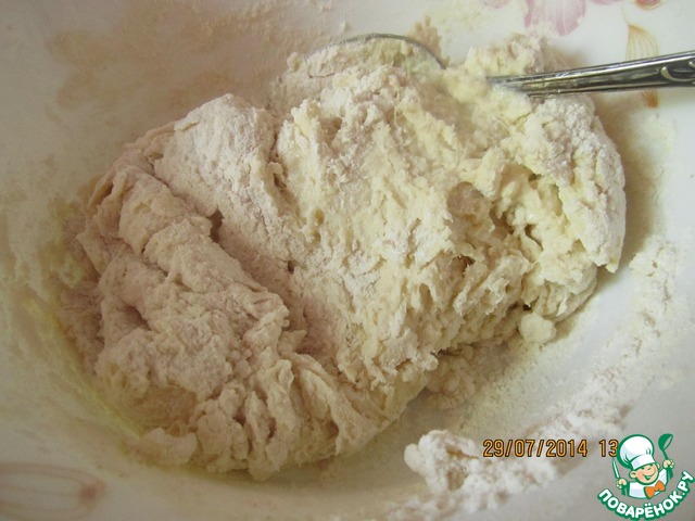 Отставить тесто, в теплое место, накрыв полотенцем. Через 30 минут тесто увеличится в объёме, его следует обмять.