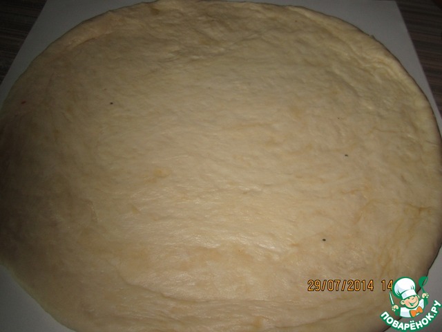Переходим к формовке пиццы: Тесто раскатываем тонкой, круглой лепешкой.
