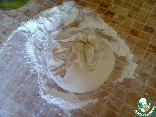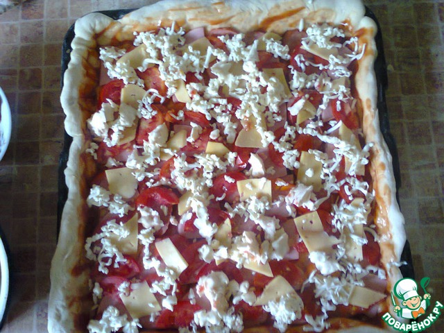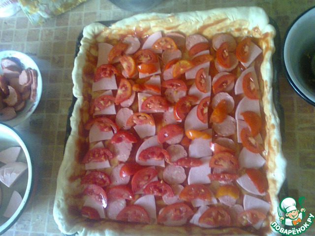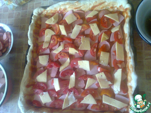4-раскатать и выложить на смазанный маслом противень. Дать тесту минут 10 подняться. и только после этого выкладывать ингредиенты.