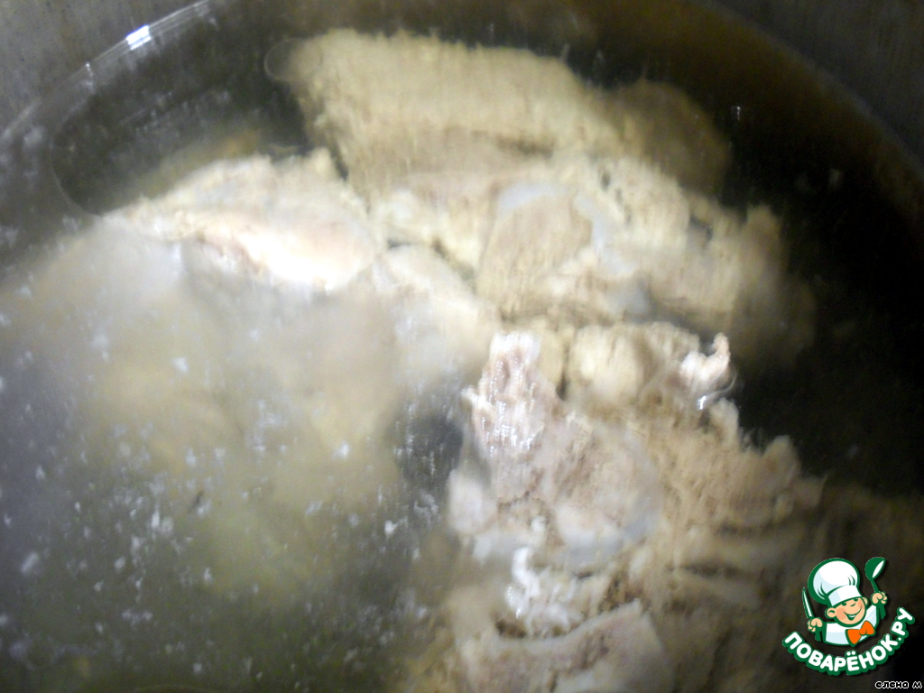 Сварить из свинины бульон. Мясо вынуть, отделить от костей.