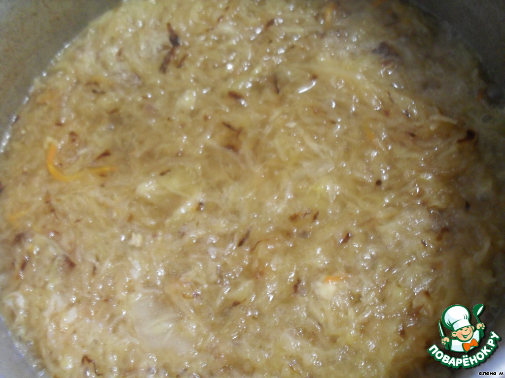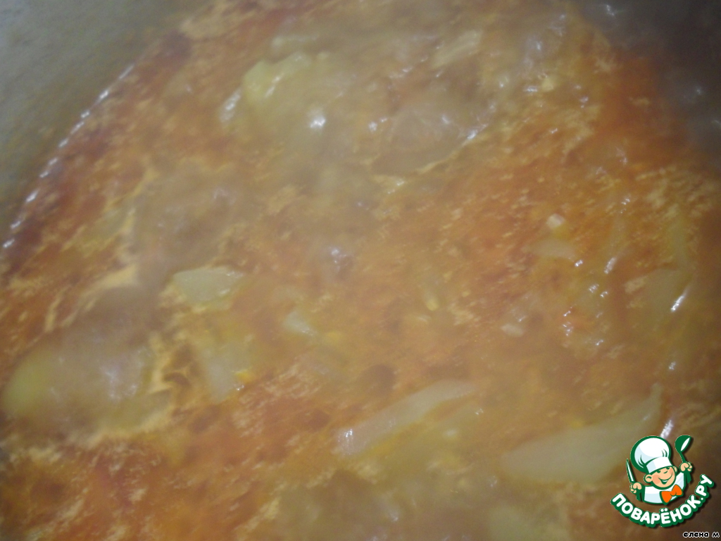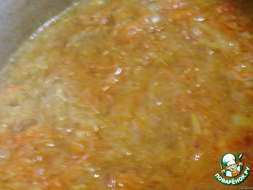 Тушеную капусту положить в кипящий бульон, варить 10 минут.