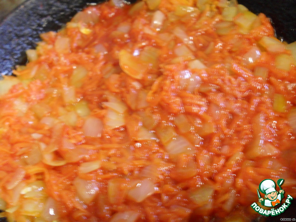 Лук, морковь и томатную пасту спассеровать на растительном масле.