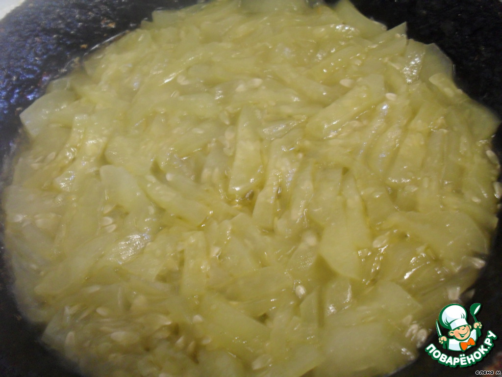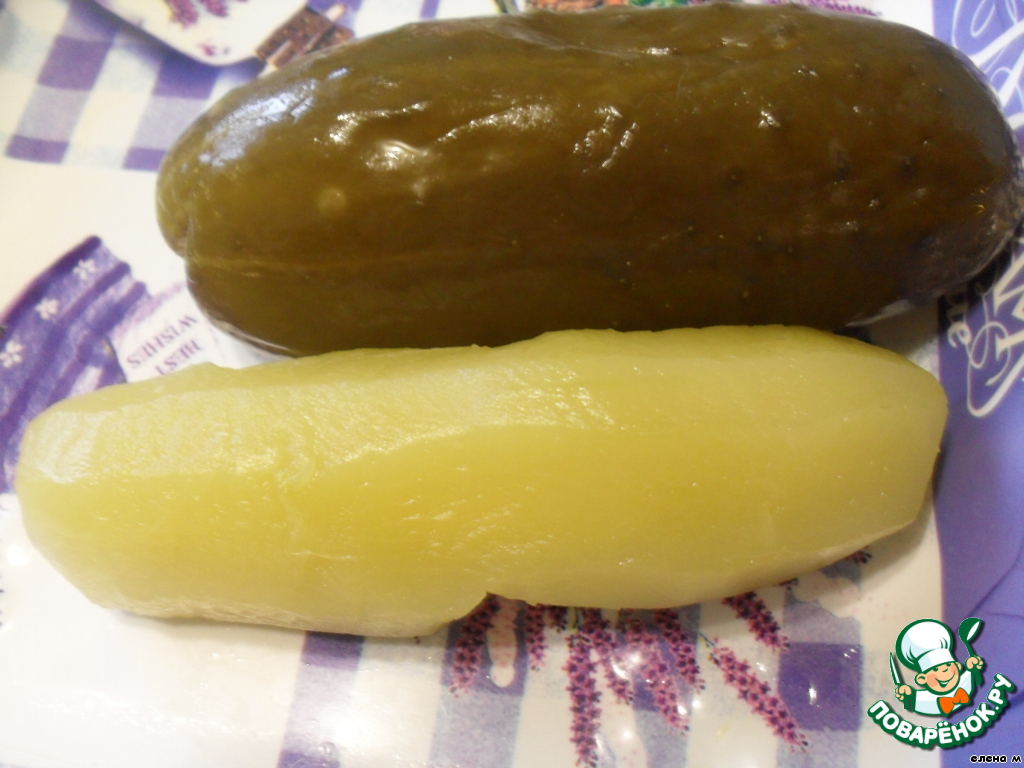 Соленые огурцы очистить от кожицы, нарезать соломкой (если семена крупные, удалить).