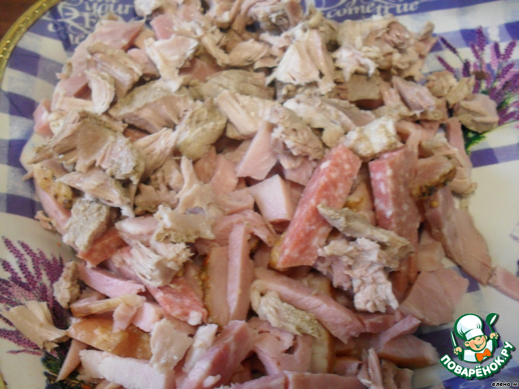 Мясное ассорти (я обычно, покупая колбасу, ветчину, окорок, варено-копченое мясо отрезаю кусочек, кладу в пакет и убираю в морозилку).